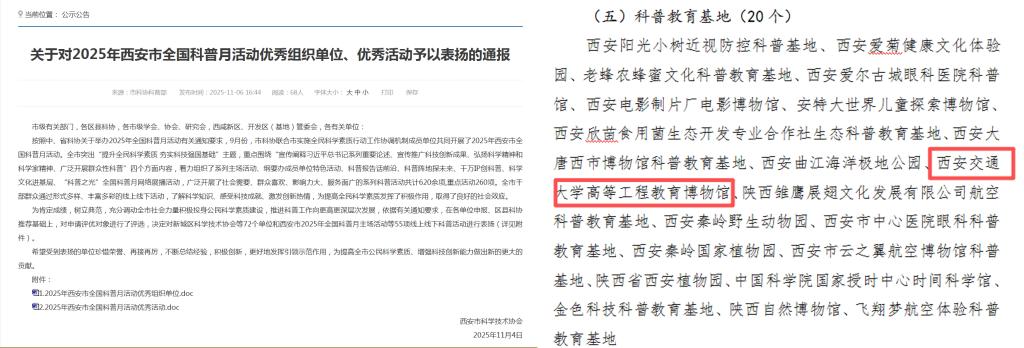 近日,西安市科学技术协会发布《关于对2025年西安市全国科普月活动优秀组织单位、优秀活动予以表扬的通报》,西安交通大学高等工程教育博物馆作为西安市科普教育基地获评“2025年西安市全国科普月活动优秀组织单位”。